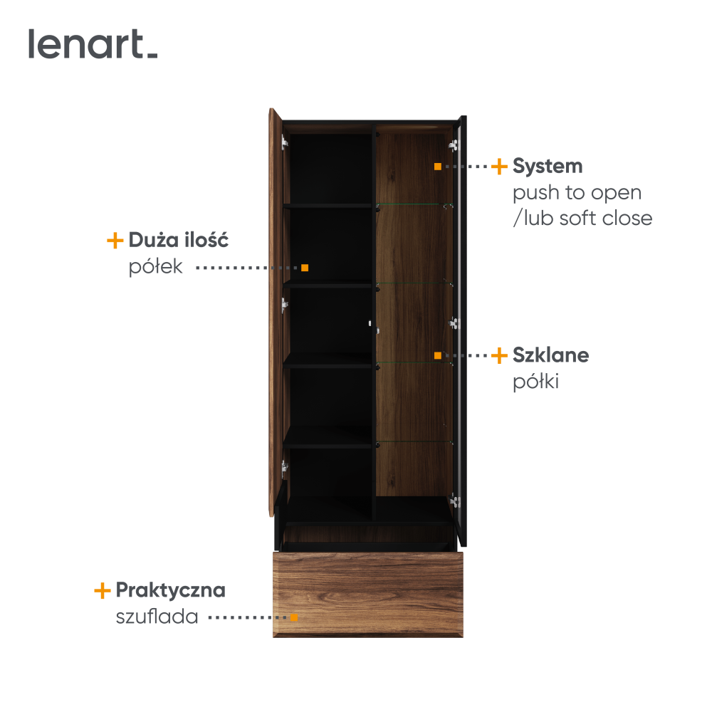 Wewnątrz witryny znajduje się przestronny regał, który zapewnia dużo miejsca do przechowywania, a na dole mebla umieszczona jest pojemna szuflada. Charakterystyczne, dzielone fronty z ciekawie frezowanymi krawędziami dodają unikalnego stylu, a system PUSH-TO-OPEN zapewnia komfort użytkowania.