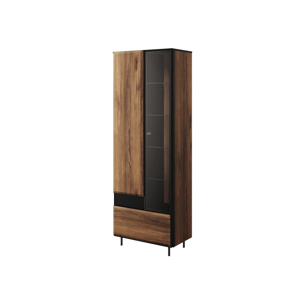 Metalowe ramy nadają charakter przeszklonej części mebla, który oferuje cztery szklane półki do zagospodarowania. Opcjonalne kierunkowe oświetlenie LED umożliwia skierowanie strumienia światła na wybrane przedmioty za szkłem.
