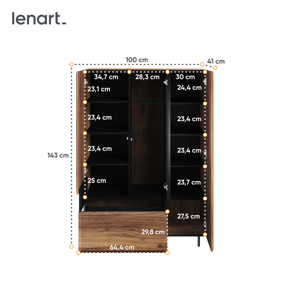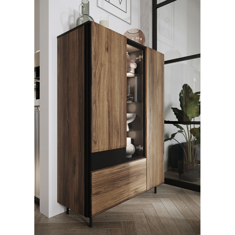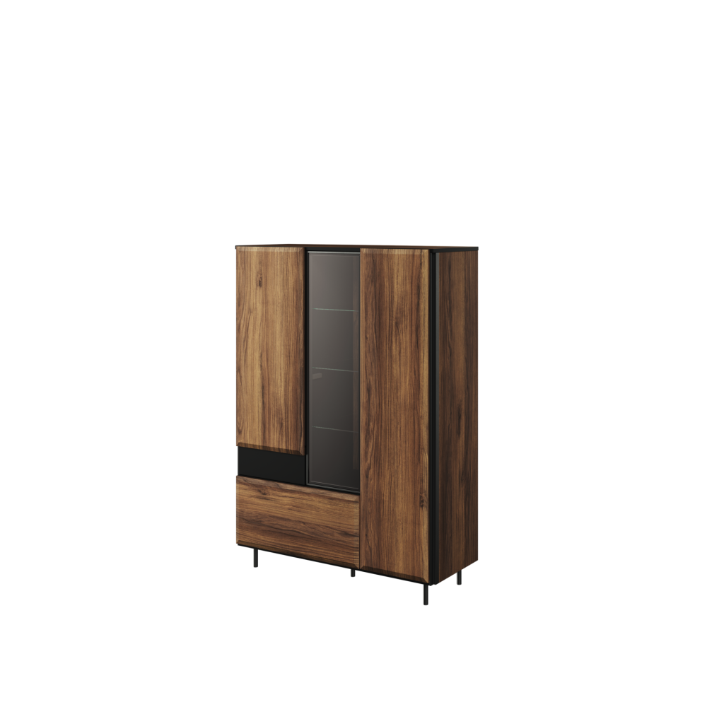 Pojemna witryna, której modna forma wyróżnia się metalowymi ramami otaczającymi przeszkloną część mebla. Wewnątrz znajdują się trzy szklane półki, które można dodatkowo podkreślić oświetleniem LED.