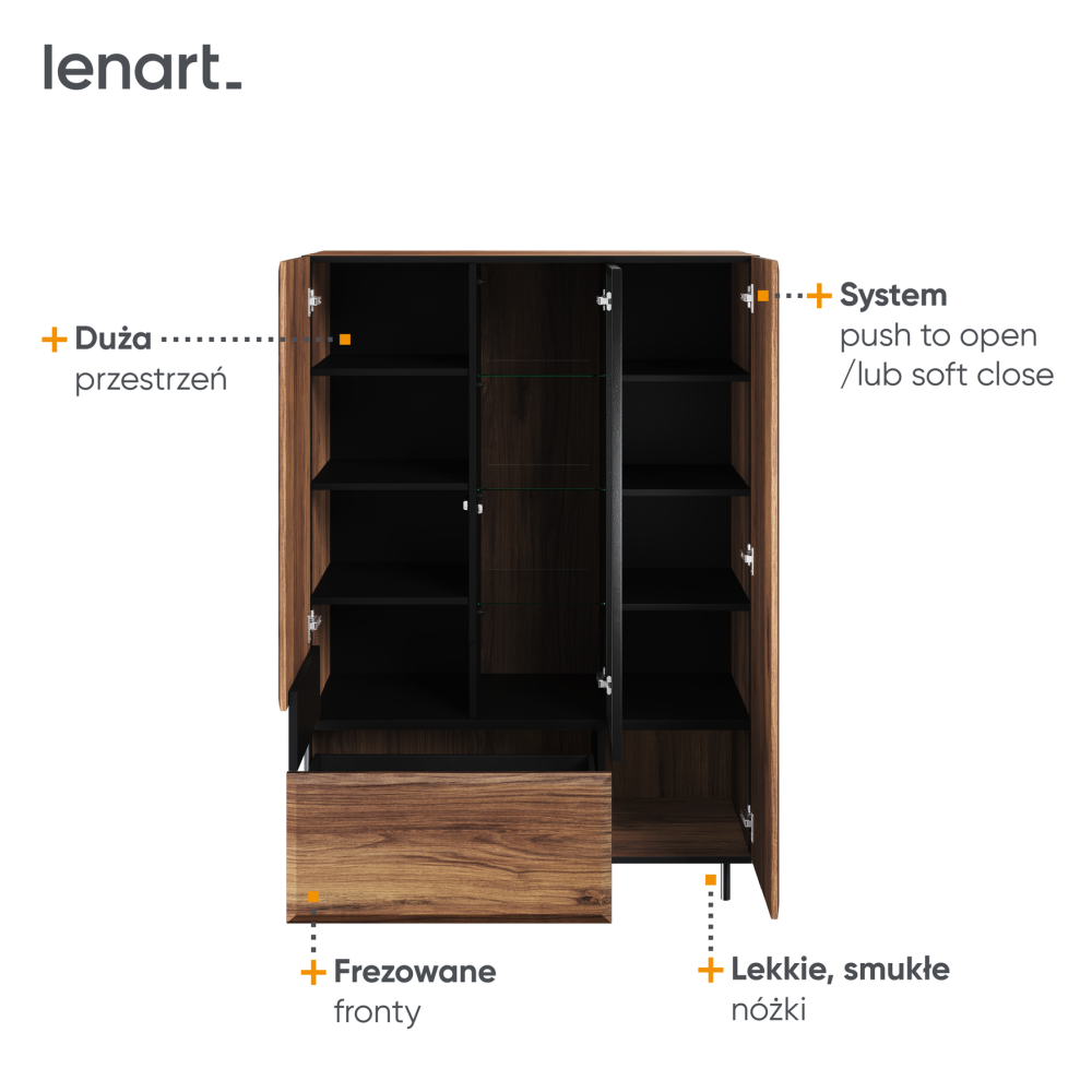 Za drzwiami ukryte są dwa przestronne regały, oferujące dużo miejsca do przechowywania, a w dolnej części mebla obszerna szuflada. Charakterystyczne, dzielone fronty z elegancko frezowanymi krawędziami dodają wyjątkowego stylu, a otwieranie ułatwia system PUSH-TO-OPEN.