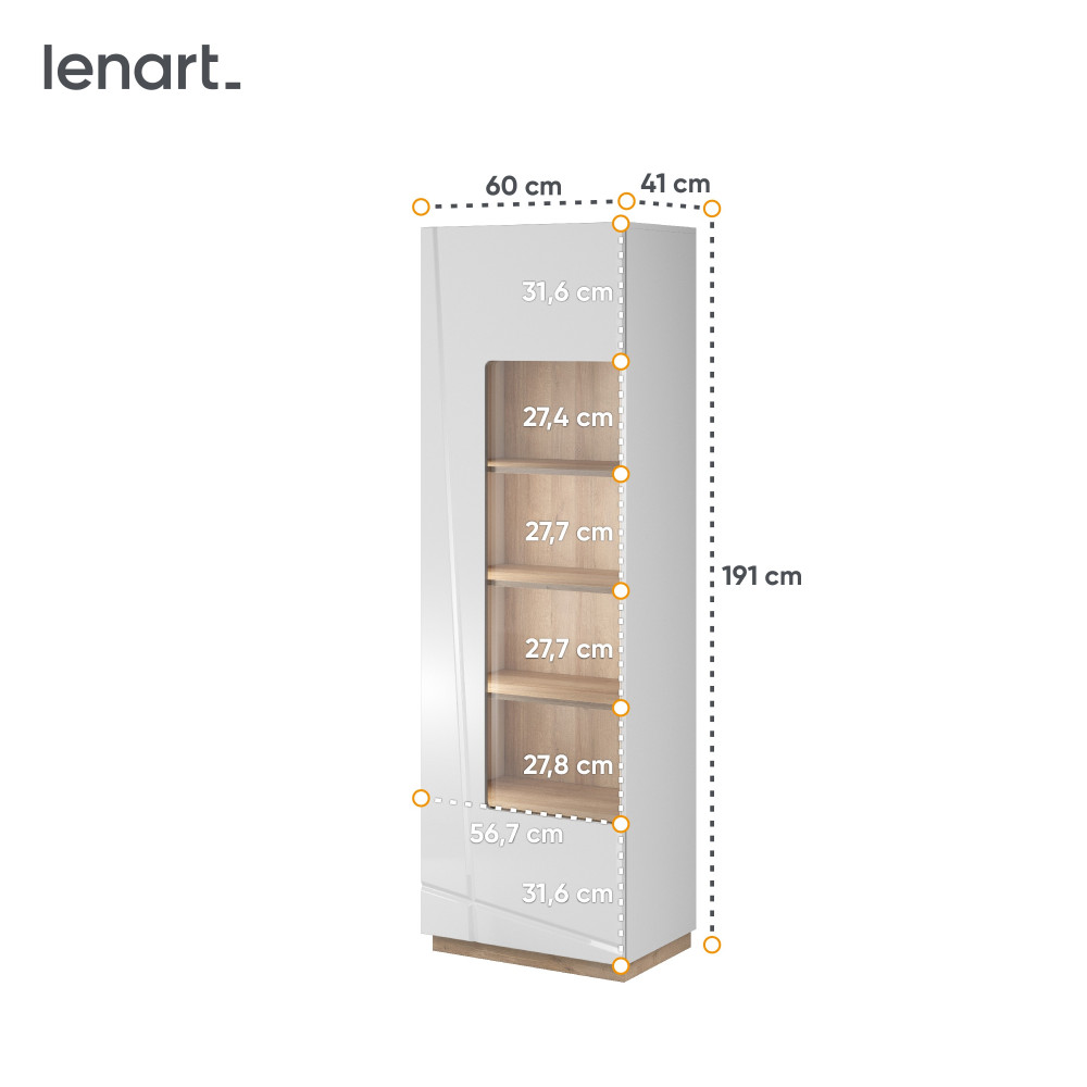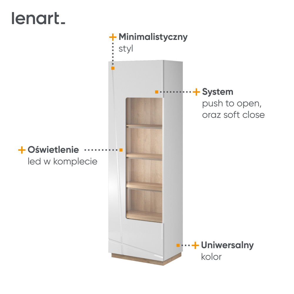 Witryna w minimalistycznym stylu to elegancka propozycja dla nowoczesnych wnętrz, łącząca połyskującą biel z naturalnymi akcentami drewna w kolorze dąb Riviera. Jej prosta, geometryczna forma wpisuje się w najnowsze trendy, dodając wnętrzu lekkości i subtelnego uroku.