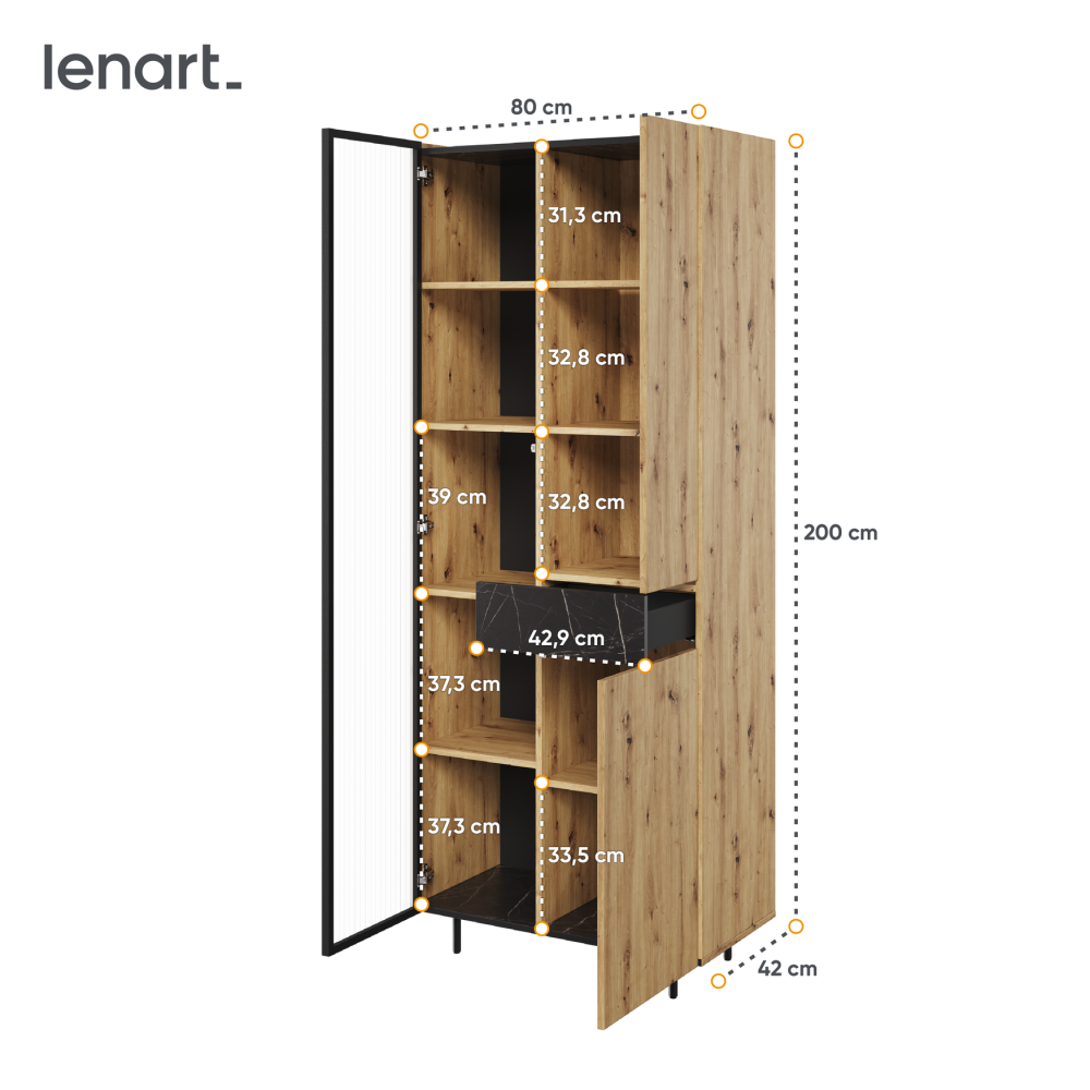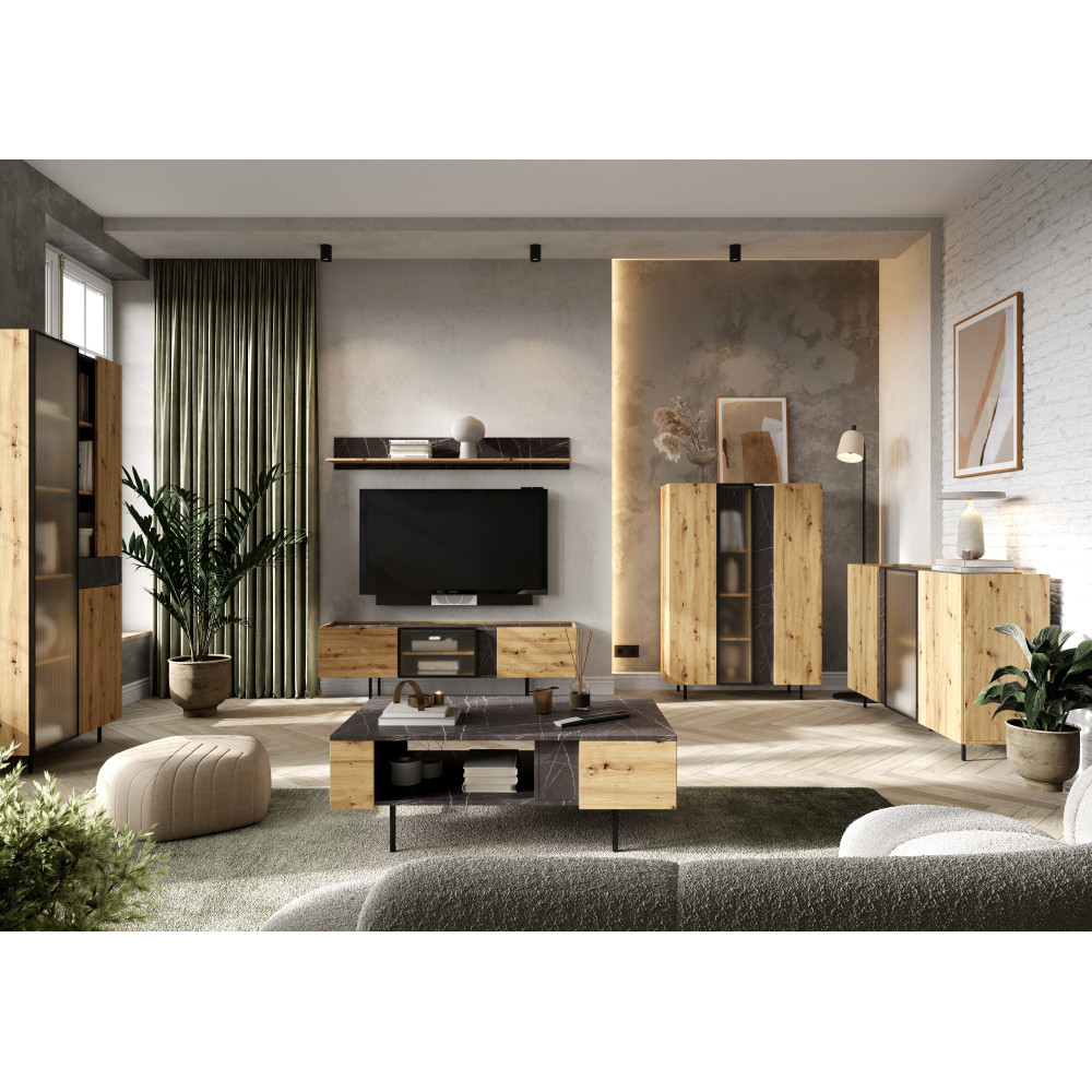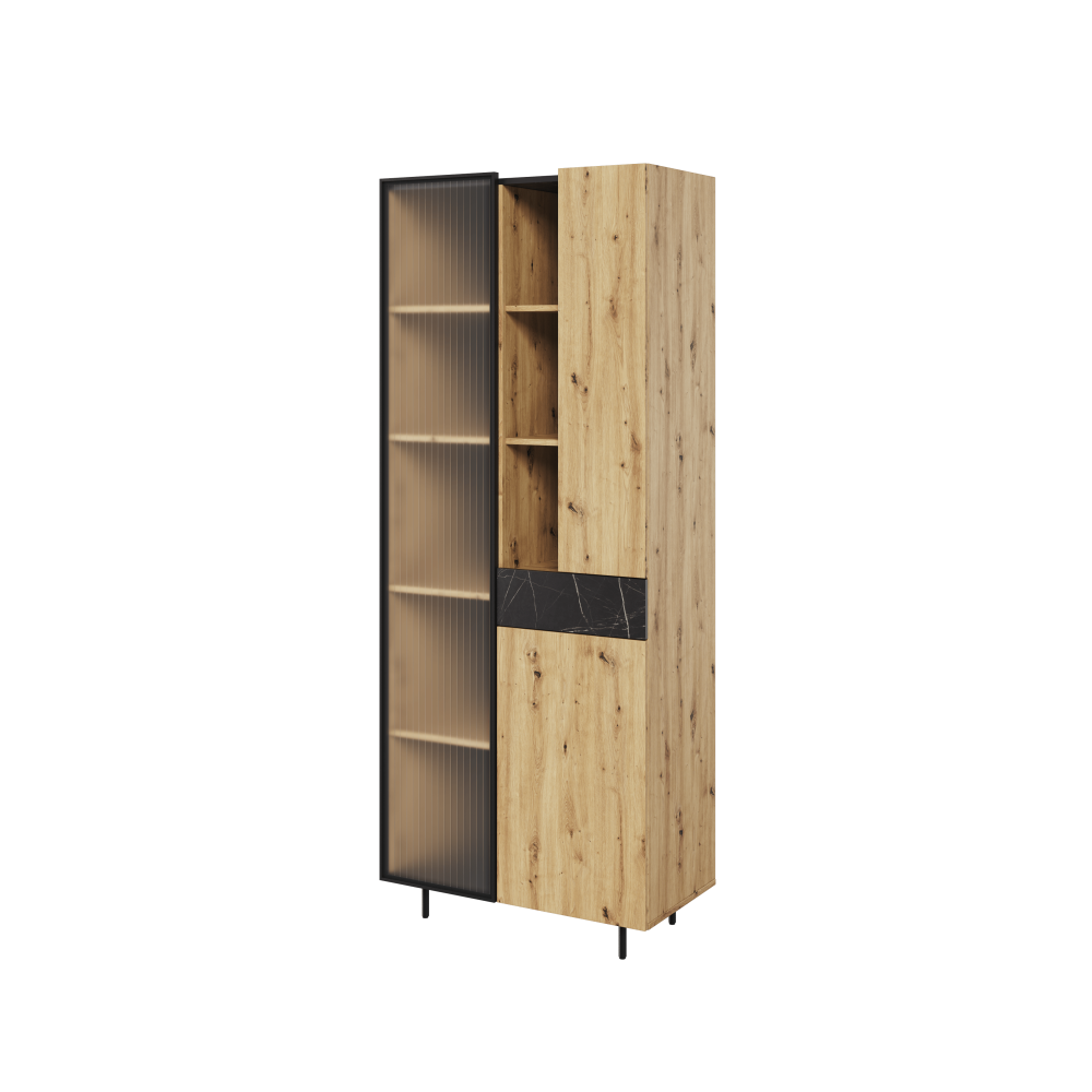 Witryna to elegancki mebel, który łączy funkcjonalność z estetyką. Osadzona na smukłych nóżkach, wyposażona w dużą ilość półek i praktyczną szufladę, oferuje sporo miejsca do przechowywania. Drzwiczki z ornamentowego szkła nadają całości subtelnego, stylowego wyglądu. Zintegrowane oświetlenie LED nie tylko podkreśla wyeksponowane dodatki, ale także tworzy przytulną, nastrojową atmosferę w pomieszczeniu.