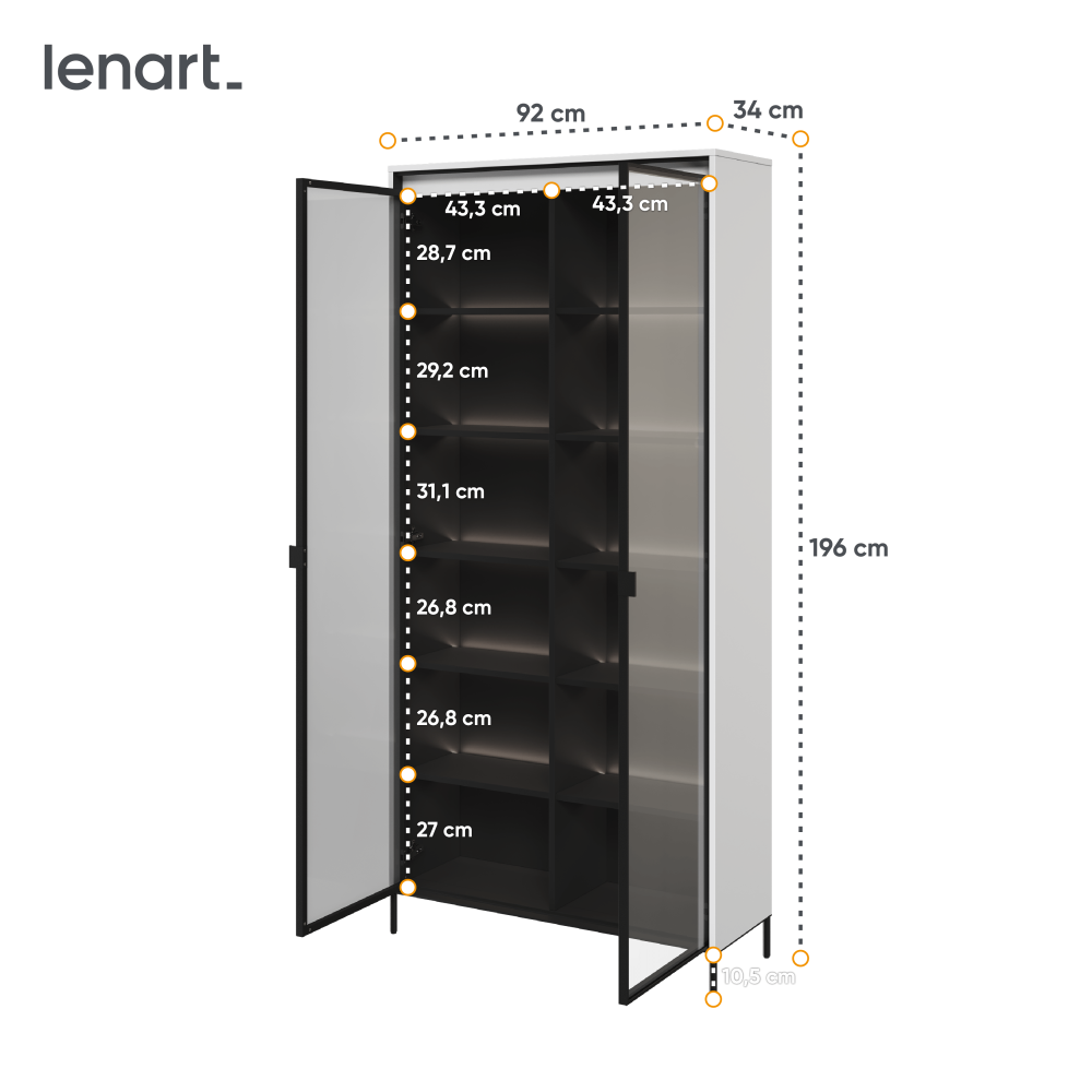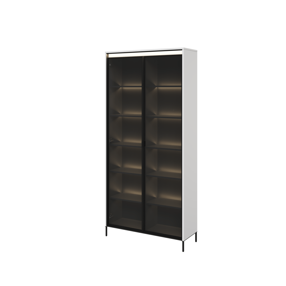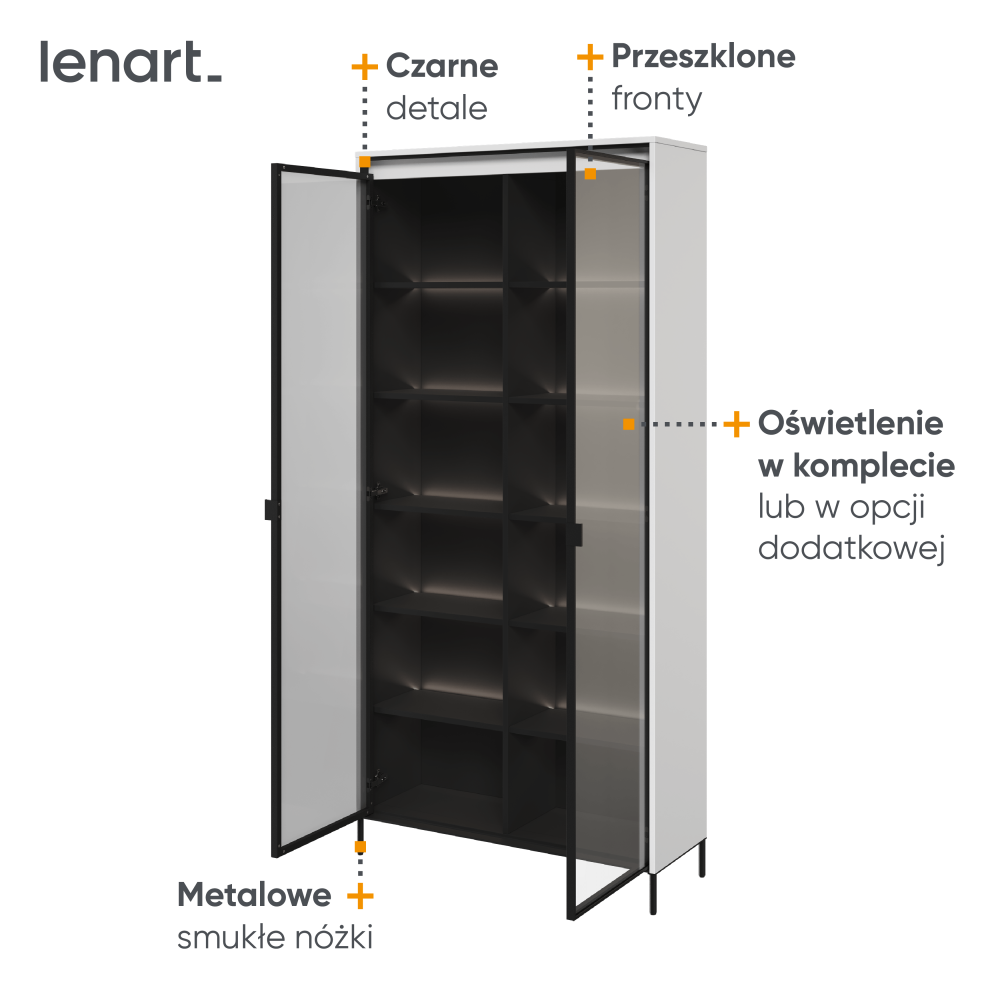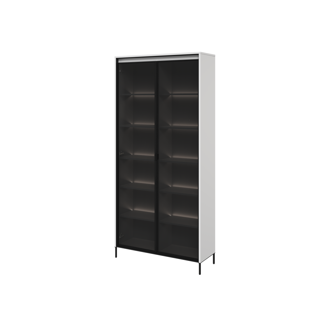 Dwudrzwiowa witryna w eleganckim białym kolorze z czarnymi detalami stanowi stylowy i funkcjonalny akcent w nowoczesnym wnętrzu. Przeszklone fronty nadają jej lekkości, pozwalając jednocześnie wyeksponować ulubione dekoracje czy zastawę. W zestawie znajduje się klimatyczne oświetlenie LED w formie paska umieszczonego pod górnym blatem, które delikatnie podkreśla wnętrze witryny, tworząc przytulną atmosferę. Dodatkowo istnieje możliwość doposażenia witryny o oświetlenie za półkami, które umożliwia jeszcze bardziej efektowną prezentację przedmiotów, dodając głębi i elegancji.