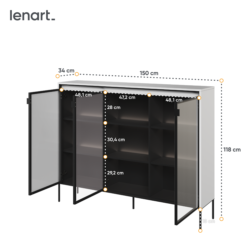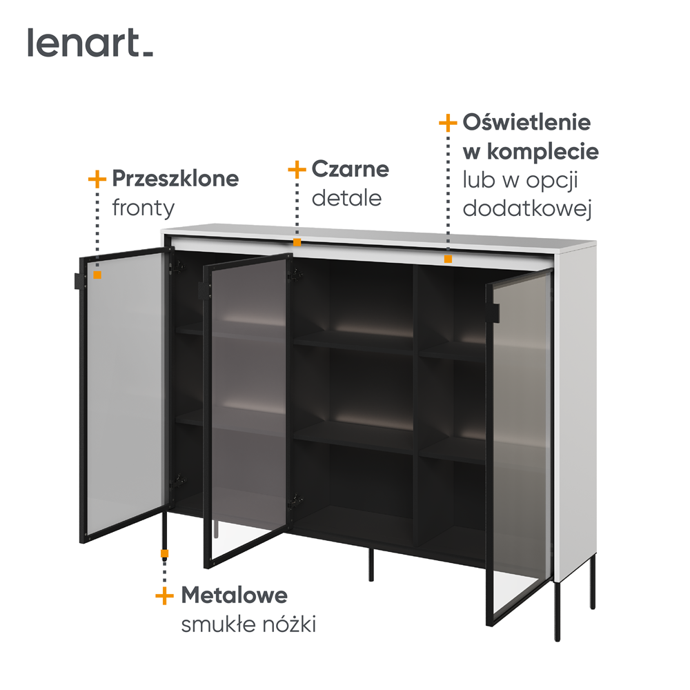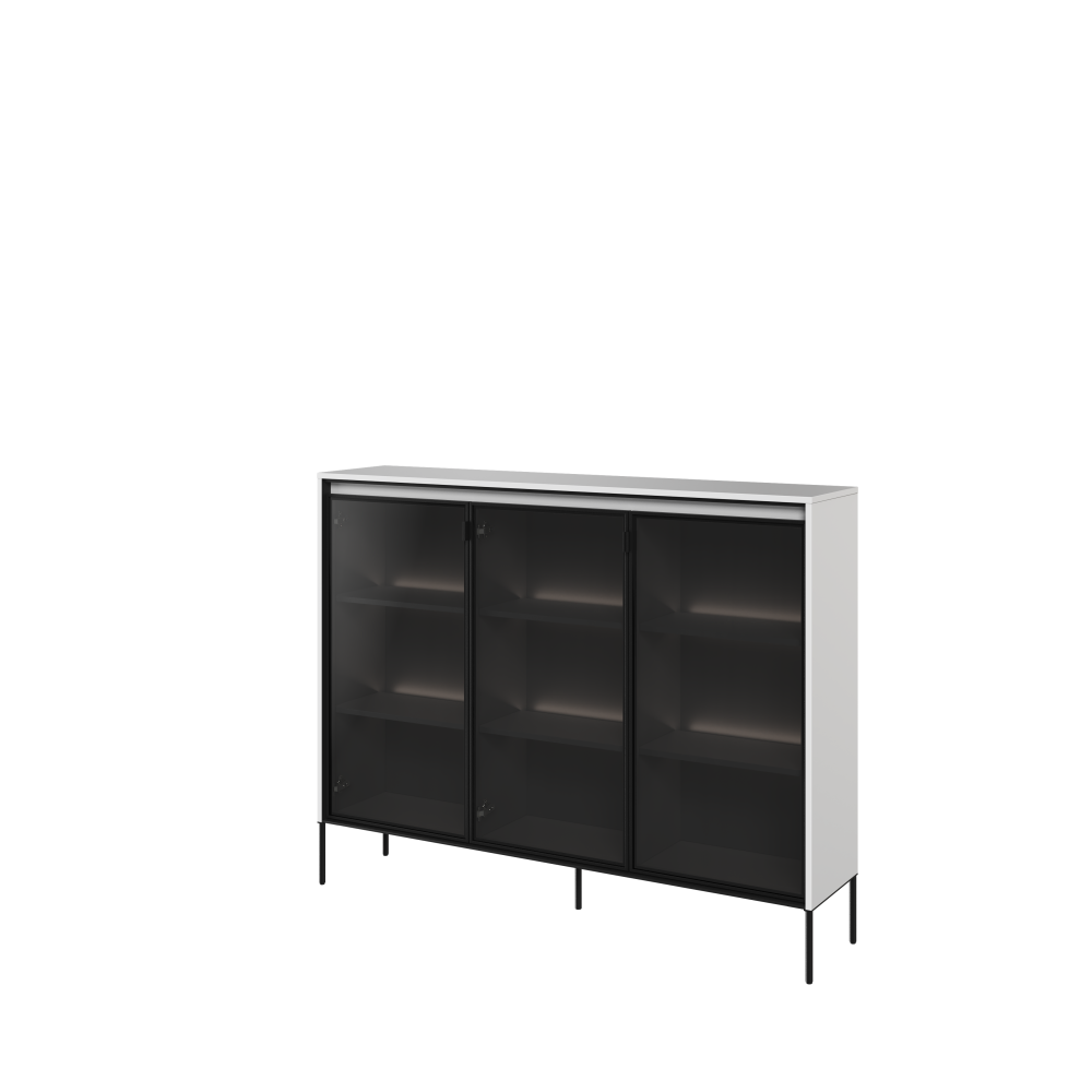 Trzydrzwiowa witryna w eleganckim białym kolorze z subtelnymi czarnymi detalami jest stylowym i funkcjonalnym rozwiązaniem do nowoczesnych wnętrz. Stabilność i lekkość nadają jej smukłe metalowe nóżki, które dodatkowo podkreślają nowoczesny charakter mebla. Przeszklone fronty wprowadzają wrażenie przestronności i umożliwiają estetyczne wyeksponowanie dekoracji, książek lub ozdobnych naczyń.